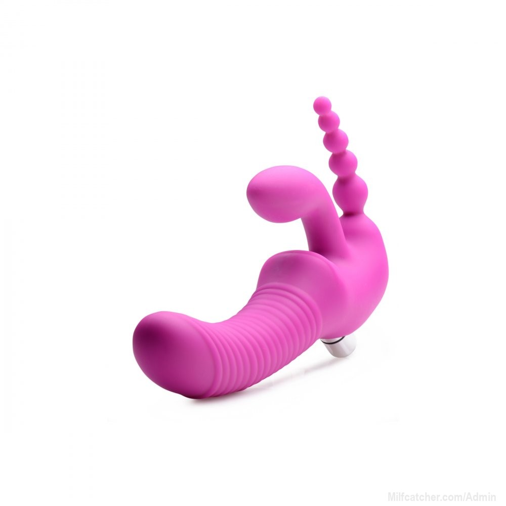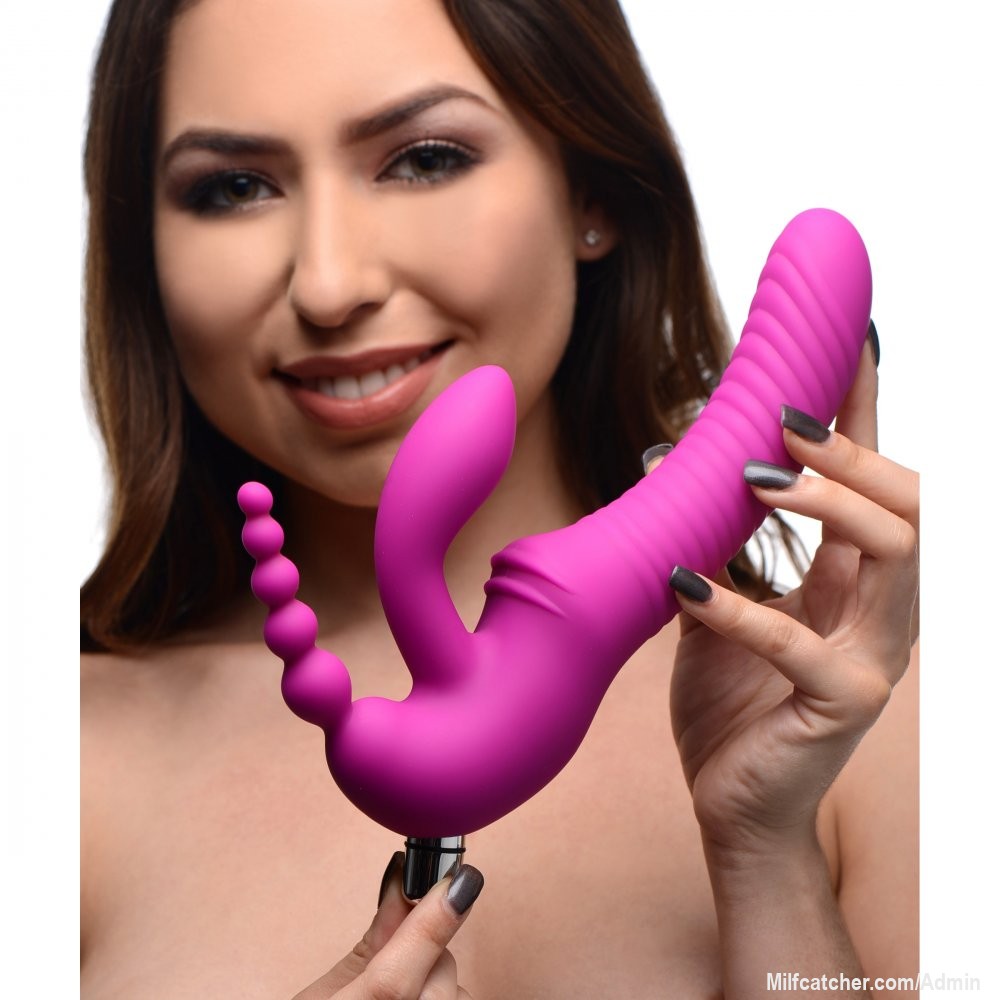 Ergonomically designed for the female body, this strapless strap-on provides clitoral, vaginal, and anal pleasure to the wearer while delivering a textured shaft with which to penetrate their partner. Furthermore, this remarkable couples toy thrums throughout all stimulation points with the power of two vibrating bullets. The bottom will appreciate a rippled, slightly curved shaft, perfect for stimulating the G-spot or P-spot. Meanwhile, the clitoral pad has two ridges that provide immense pleasure to the top with every thrust. A smooth penetrator is curved to directly target their G-spot, as well. Finally, the beaded anal stimulator provides a thrill of ecstasy as the seamless bulbs hum delightfully. This all-inclusive tool is waterproof, for enjoyment in all settings and an easy clean with mild soap and water. Made of premium silicone, it is non-porous, phthalate-free, and not compatible with silicone lubricants.